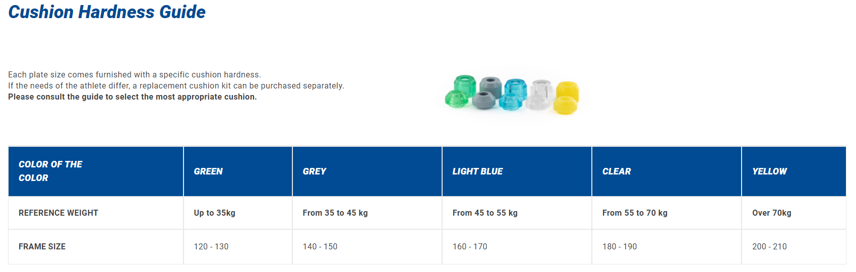 - Elastomer cushions available in 5 hardnesses (colors).